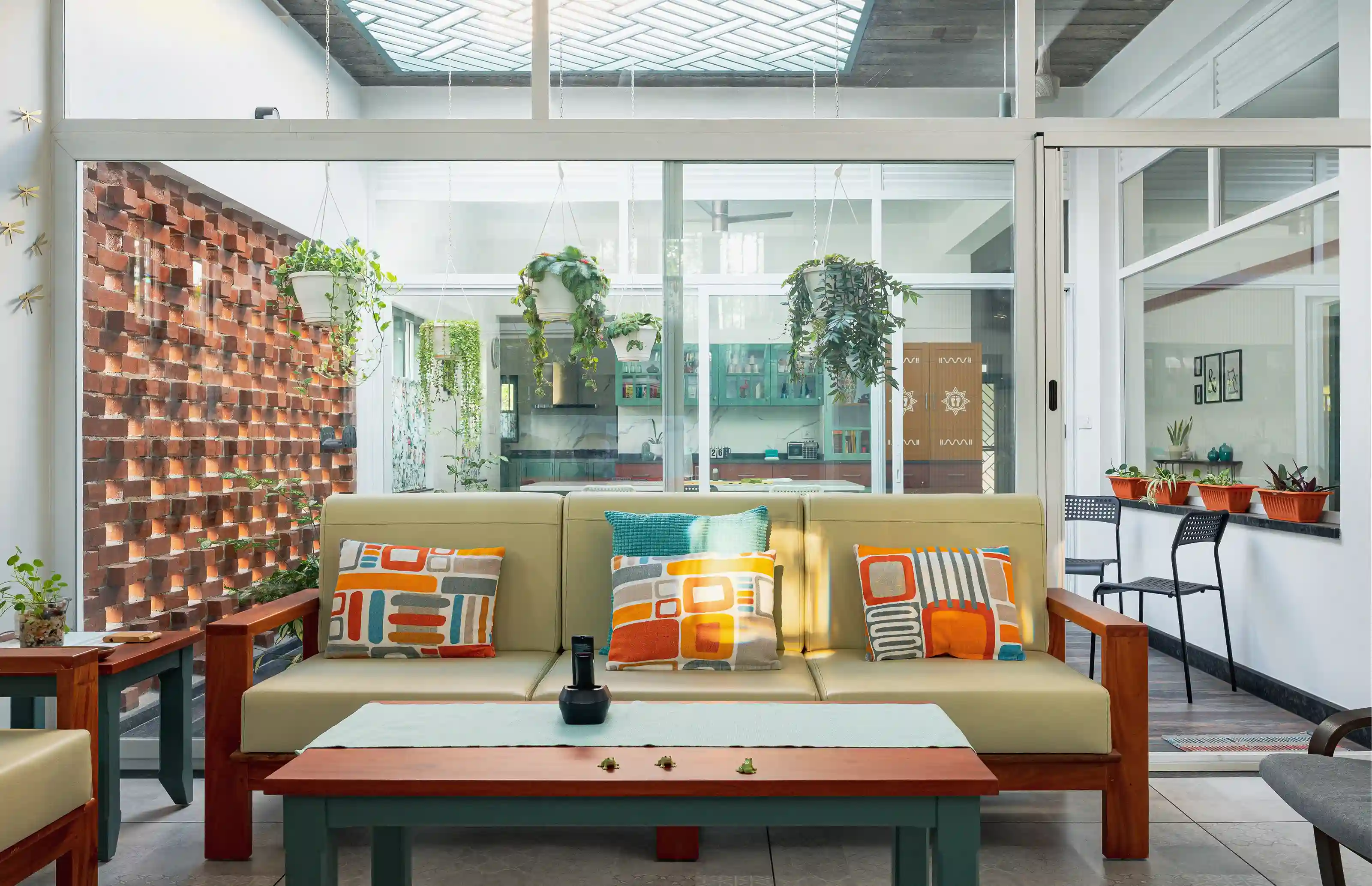 Inside, the spaces are bright, functional, and welcoming. Soft pastel tones paired with natural wood finishes bring warmth to the interiors, while large openings ensure ample daylight and ventilation. The living area feels relaxed and personal, with thoughtfully designed furniture and subtle color coordination enhancing everyday comfort.
