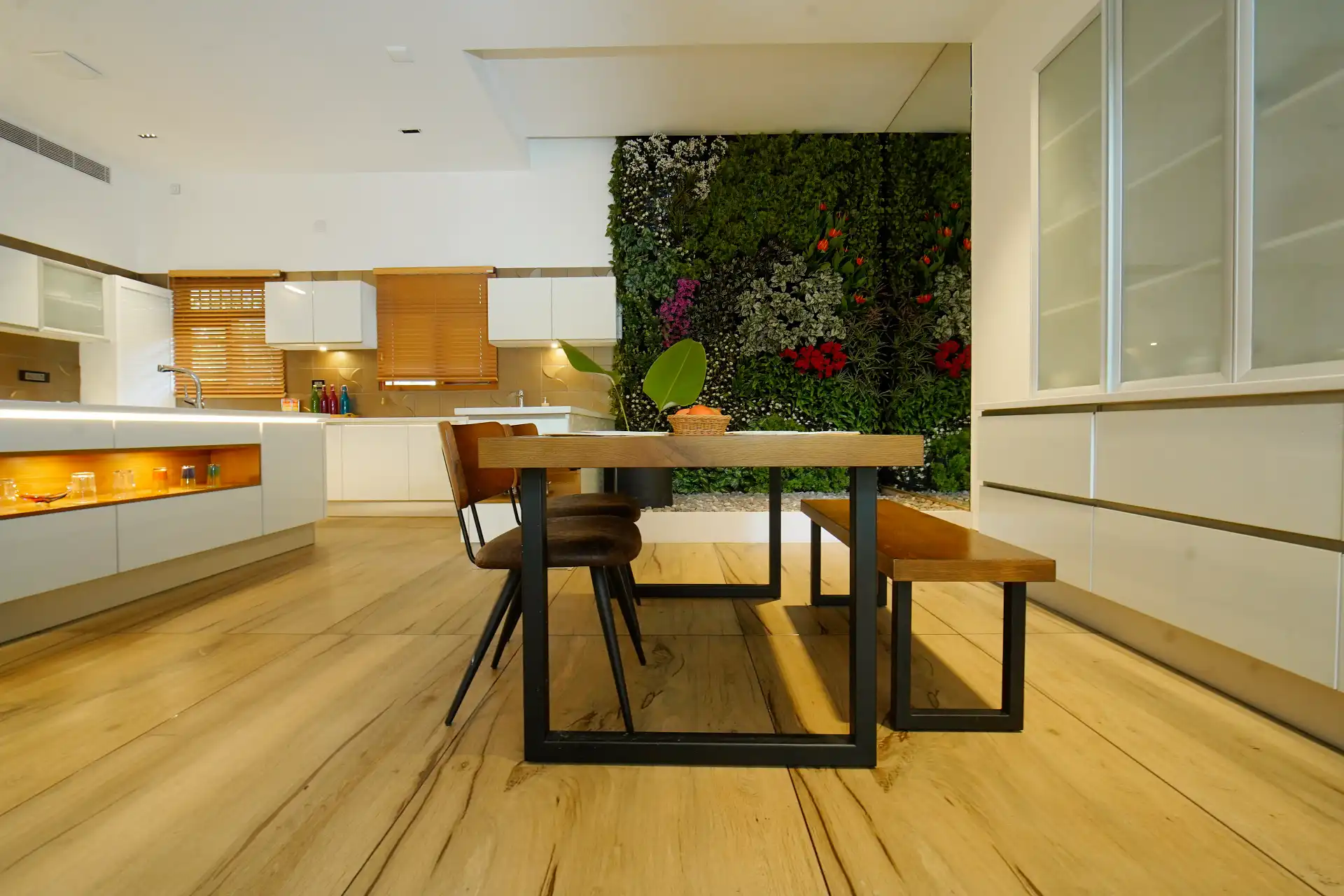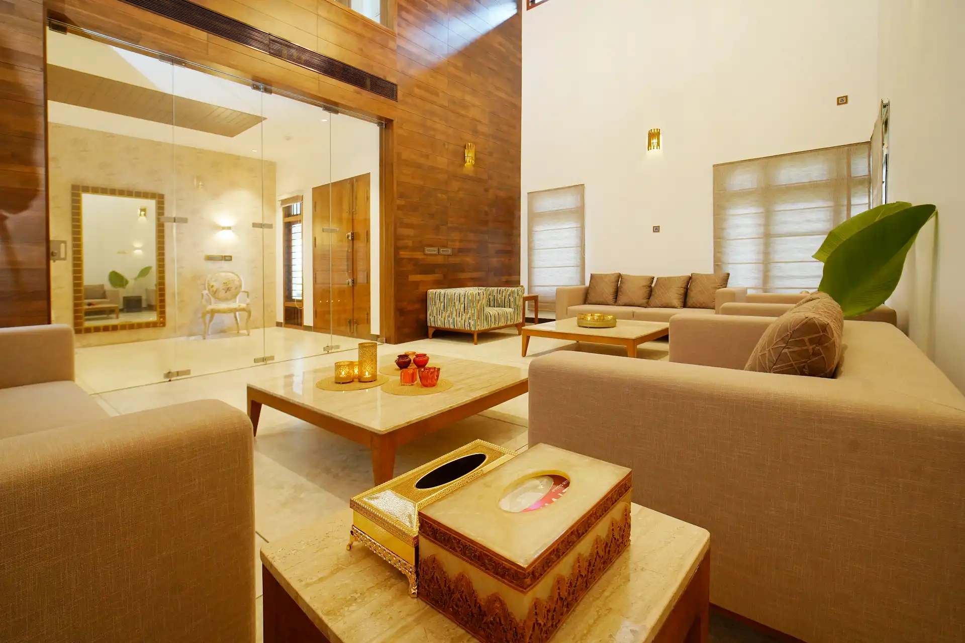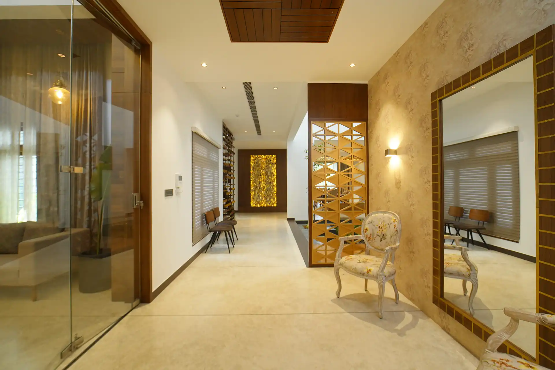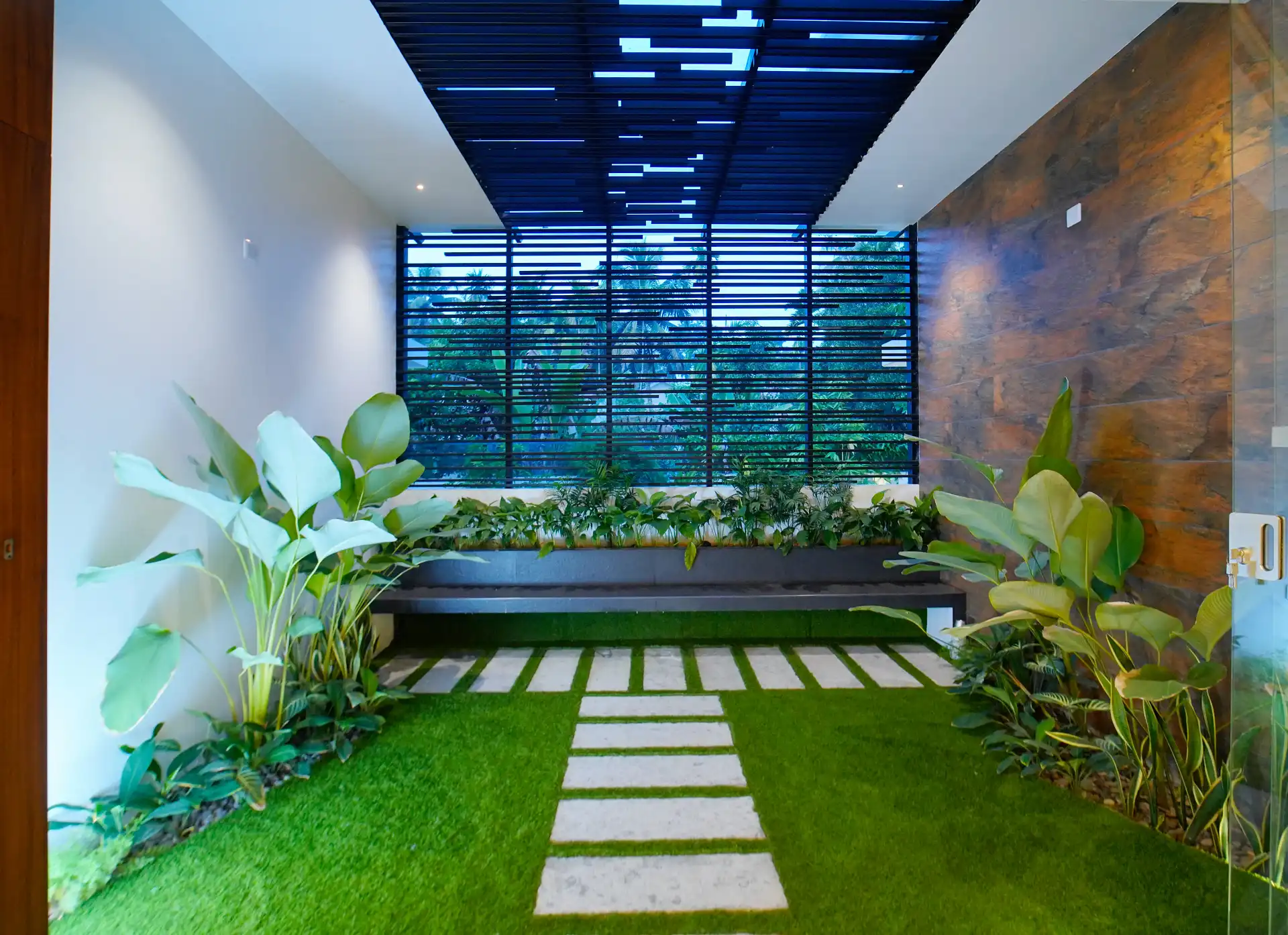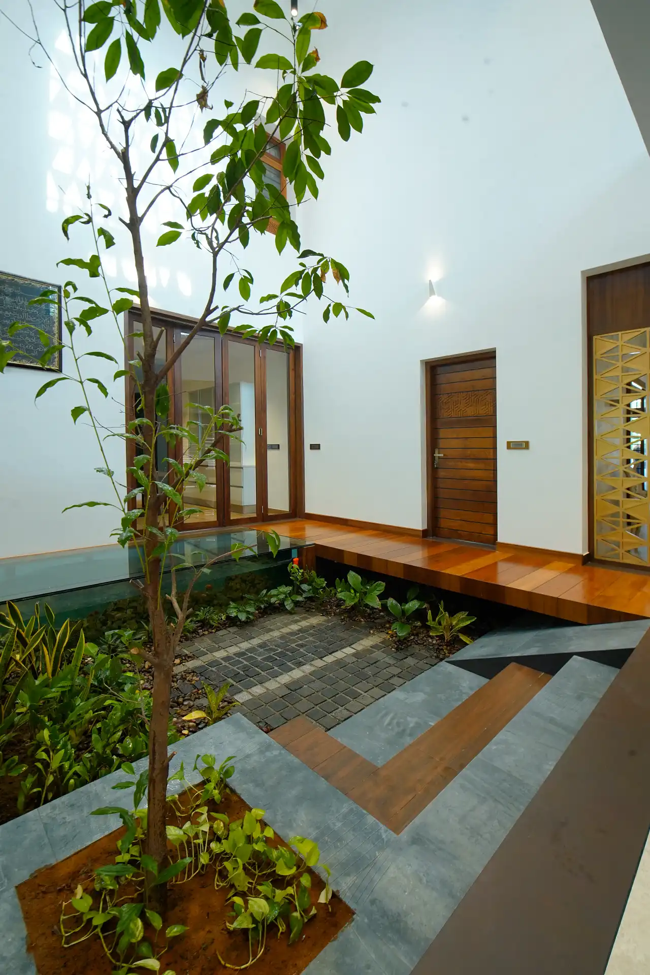 At the core of the home lies a tranquil courtyard that brings nature into everyday living. Surrounded by glass and open transitions, this space dissolves the boundary between indoors and outdoors.Natural light filters through skylights, while greenery adds life and freshness to the environment. The interplay of textures—wood, stone, and soft landscaping—creates a calming atmosphere that encourages relaxation and connection with nature.The interiors embrace a minimal yet warm aesthetic, where every element is thoughtfully curated. Neutral tones, textured walls, and wooden accents create a sense of understated elegance.