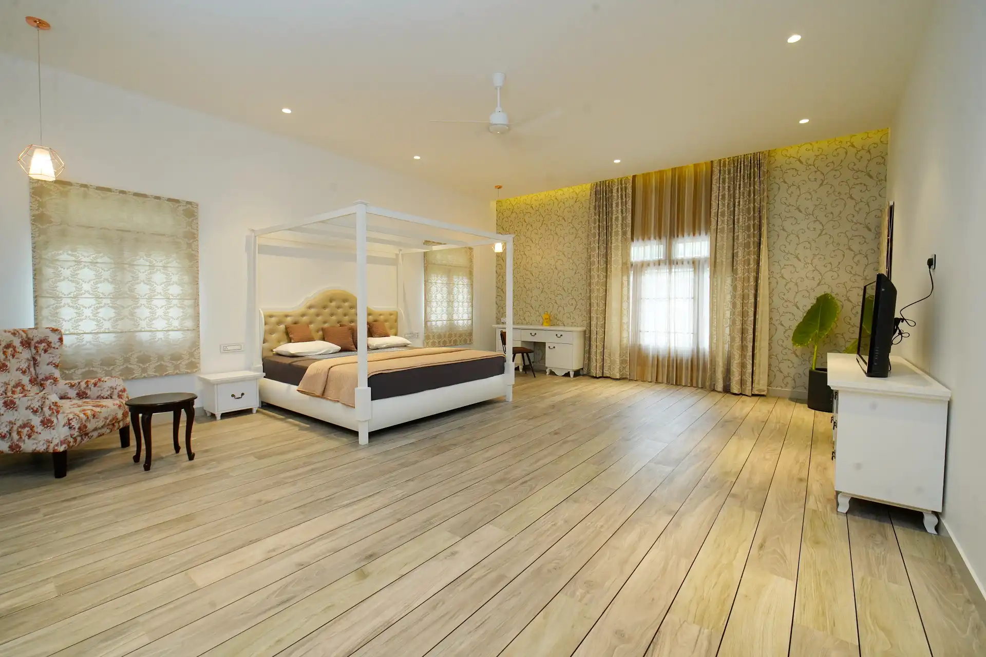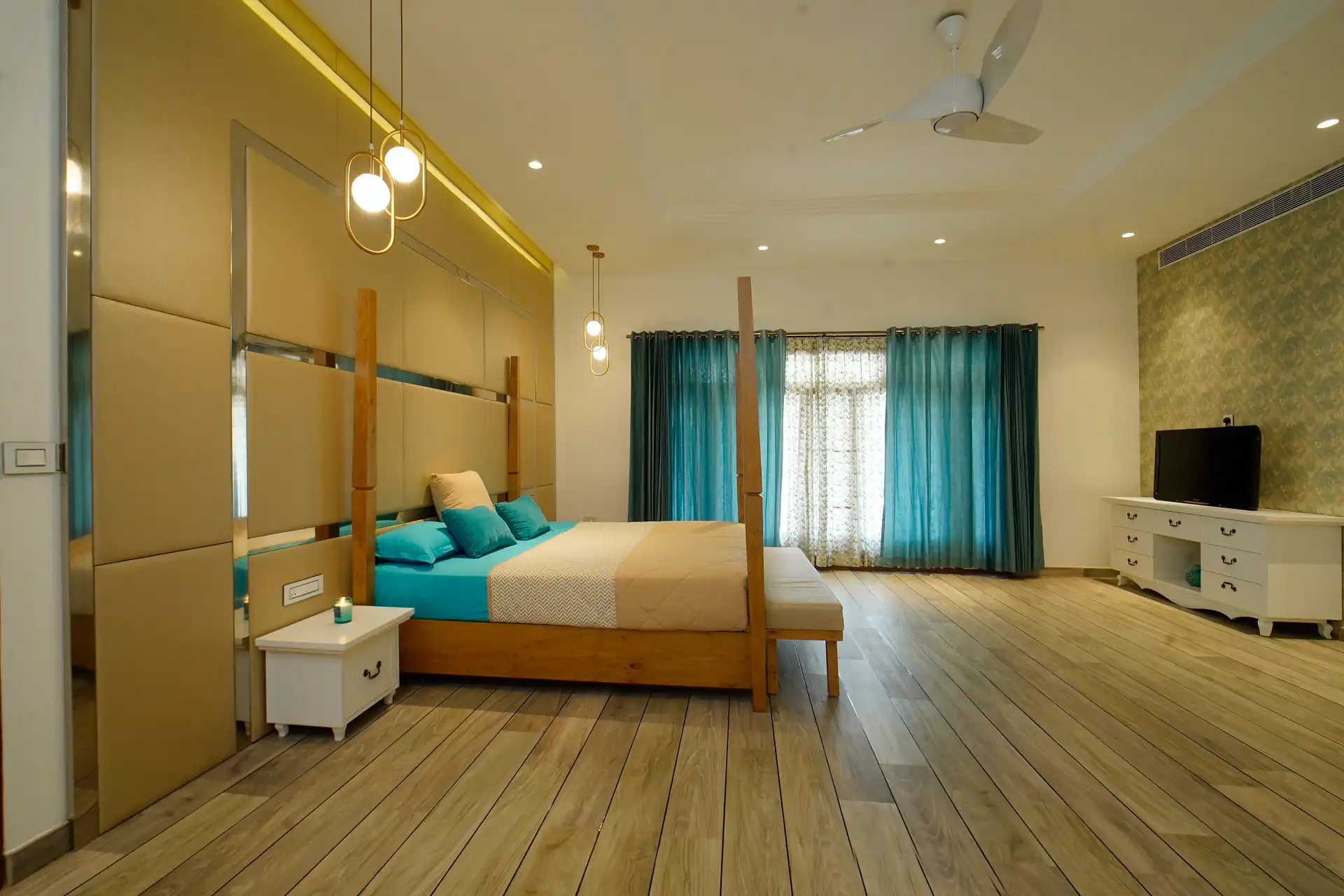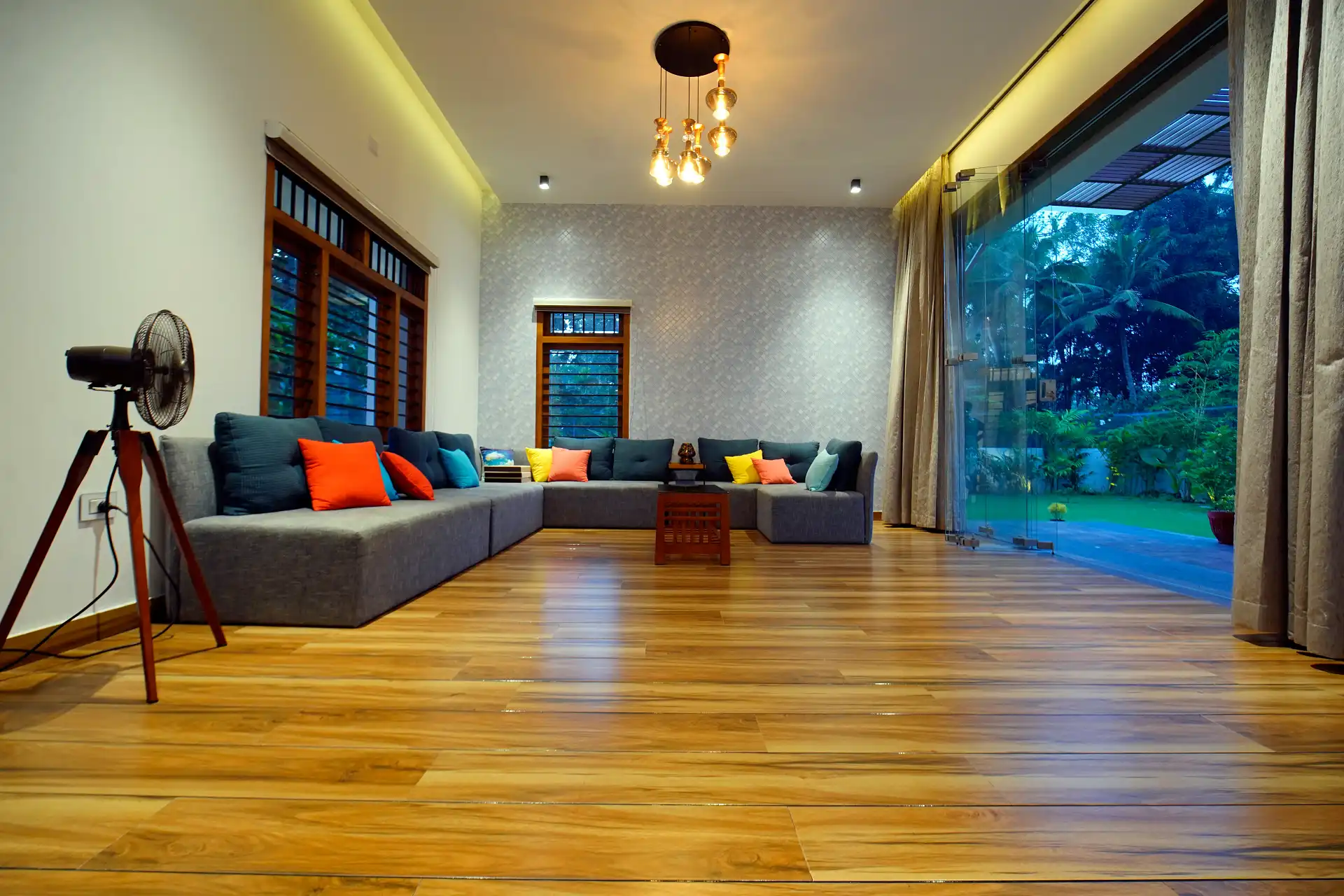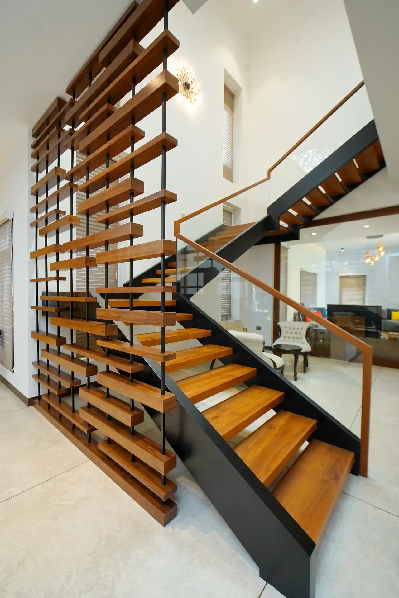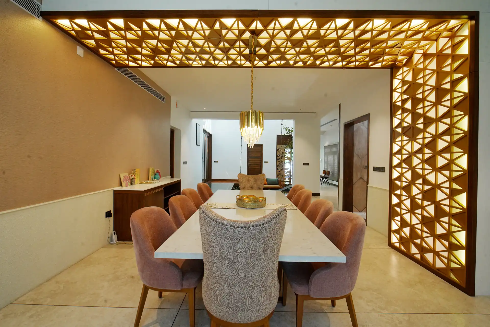 At the core of the home lies a tranquil courtyard that brings nature into everyday living. Surrounded by glass and open transitions, this space dissolves the boundary between indoors and outdoors.Natural light filters through skylights, while greenery adds life and freshness to the environment. The interplay of textures—wood, stone, and soft landscaping—creates a calming atmosphere that encourages relaxation and connection with nature.The interiors embrace a minimal yet warm aesthetic, where every element is thoughtfully curated. Neutral tones, textured walls, and wooden accents create a sense of understated elegance.