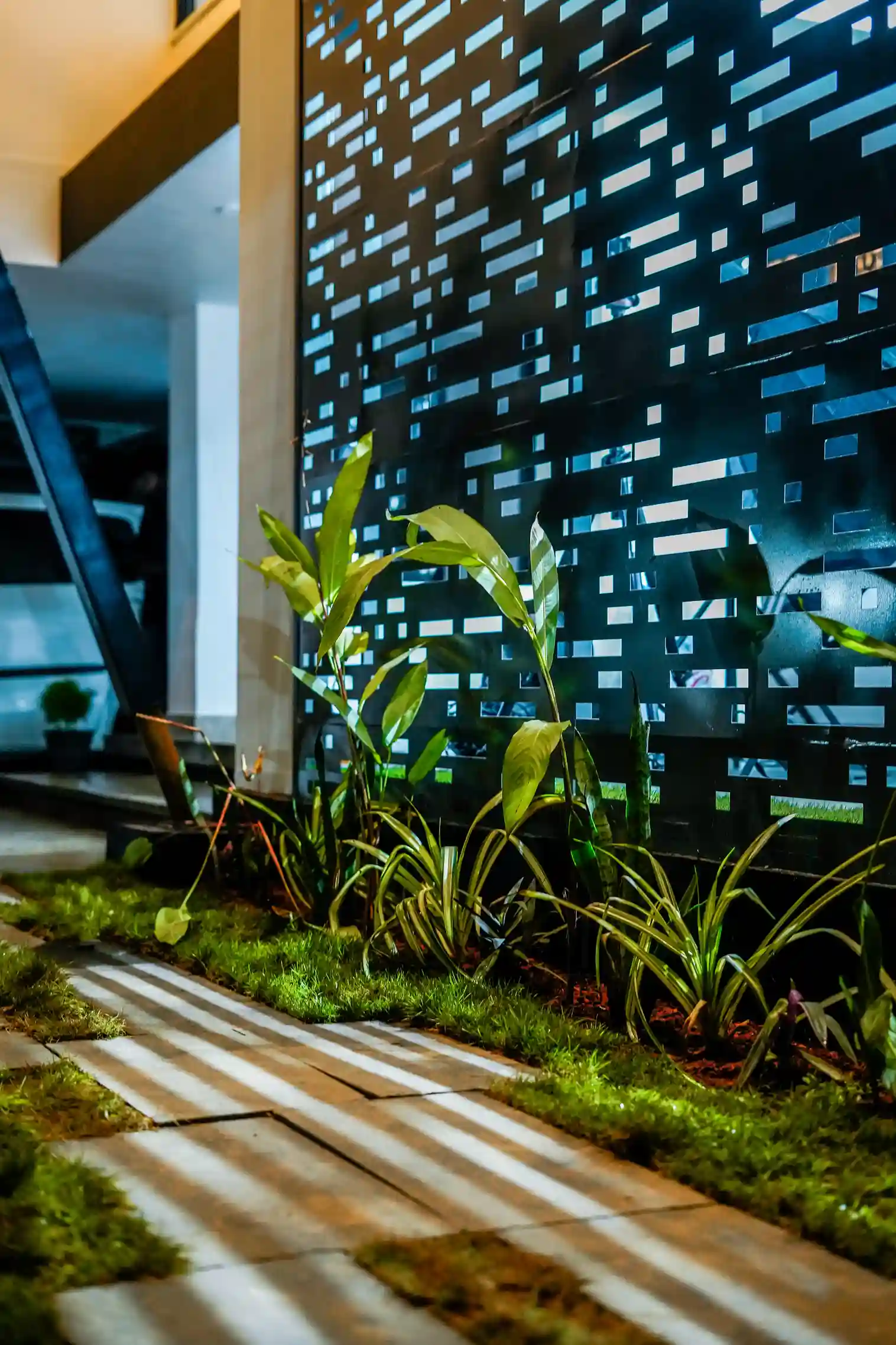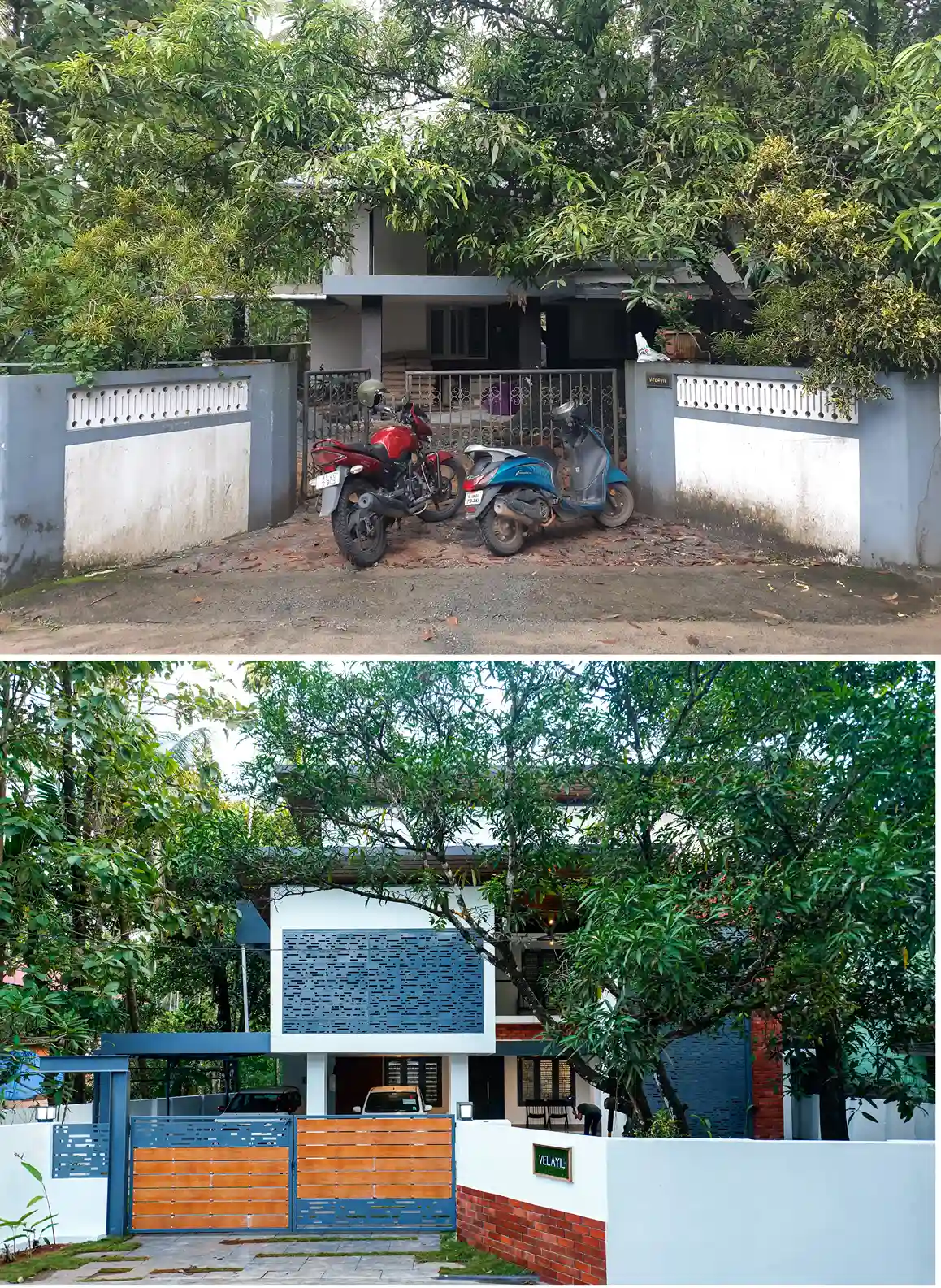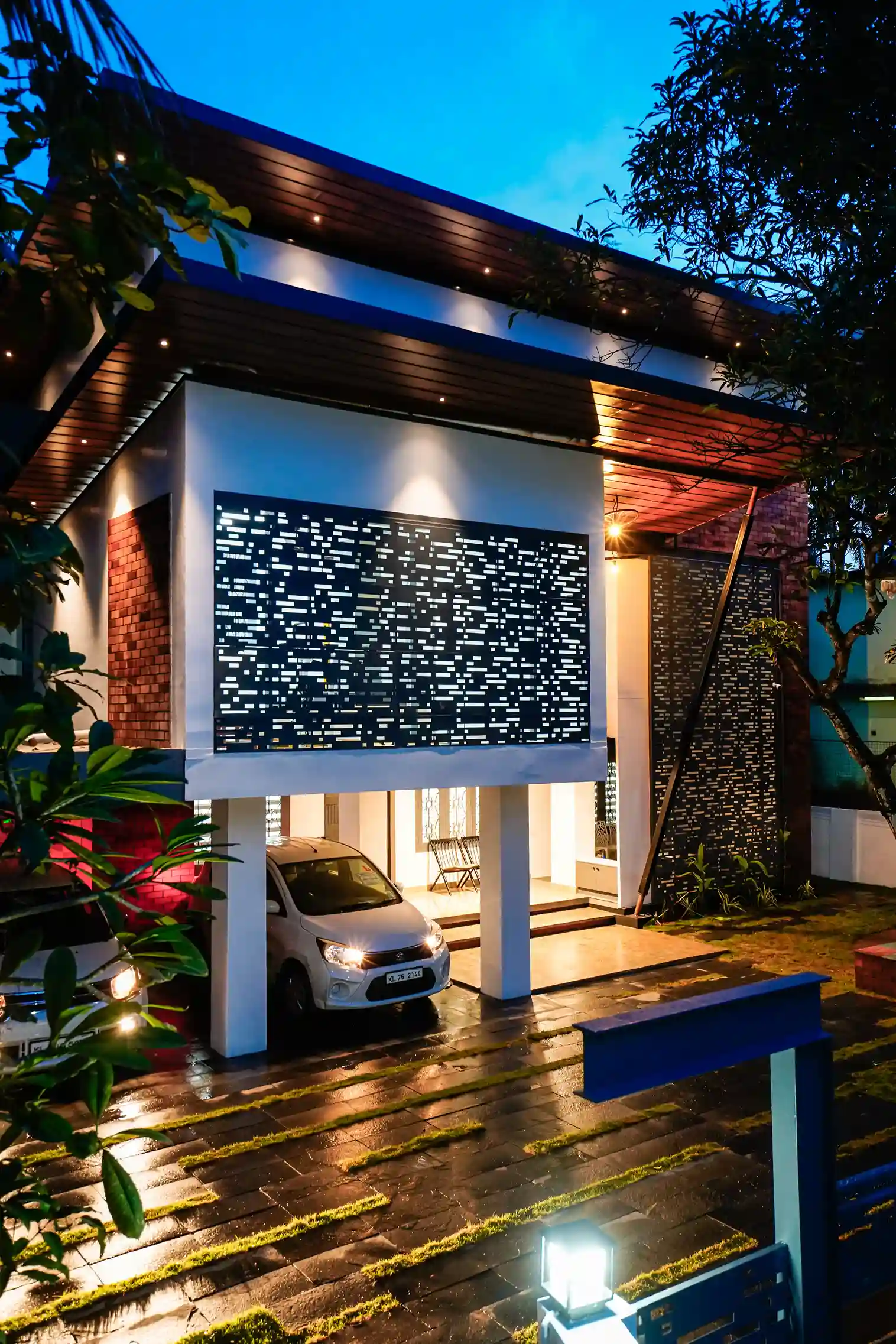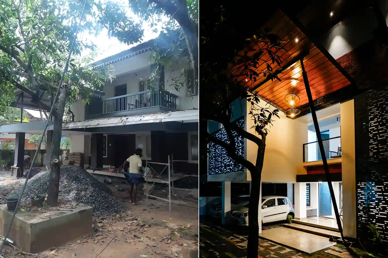 The facade evolves from a simple, aging exterior into a bold composition of textured surfaces, perforated screens, and warm material accents. Carefully integrated lighting highlights architectural elements at night, giving the home a striking presence while maintaining a cozy, lived-in feel.