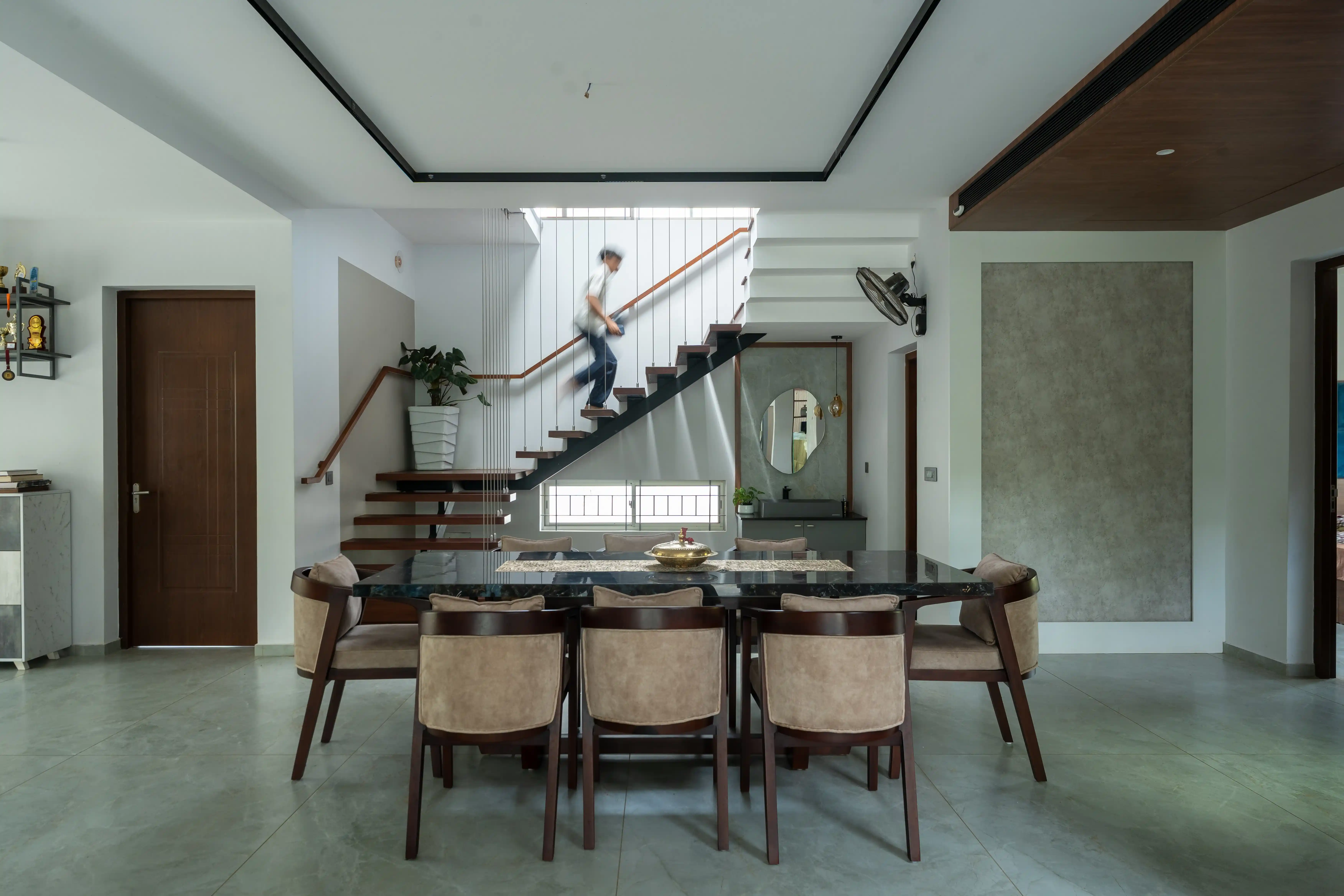 Inside, the spaces are bright and uncluttered, defined by clean lines, neutral palettes, and subtle contrasts. The dining area seamlessly integrates with a sleek staircase, while the living spaces feel soft and inviting with layered textures, warm lighting, and carefully chosen furniture. Large openings and curtains filter natural light, enhancing comfort and spatial calm.