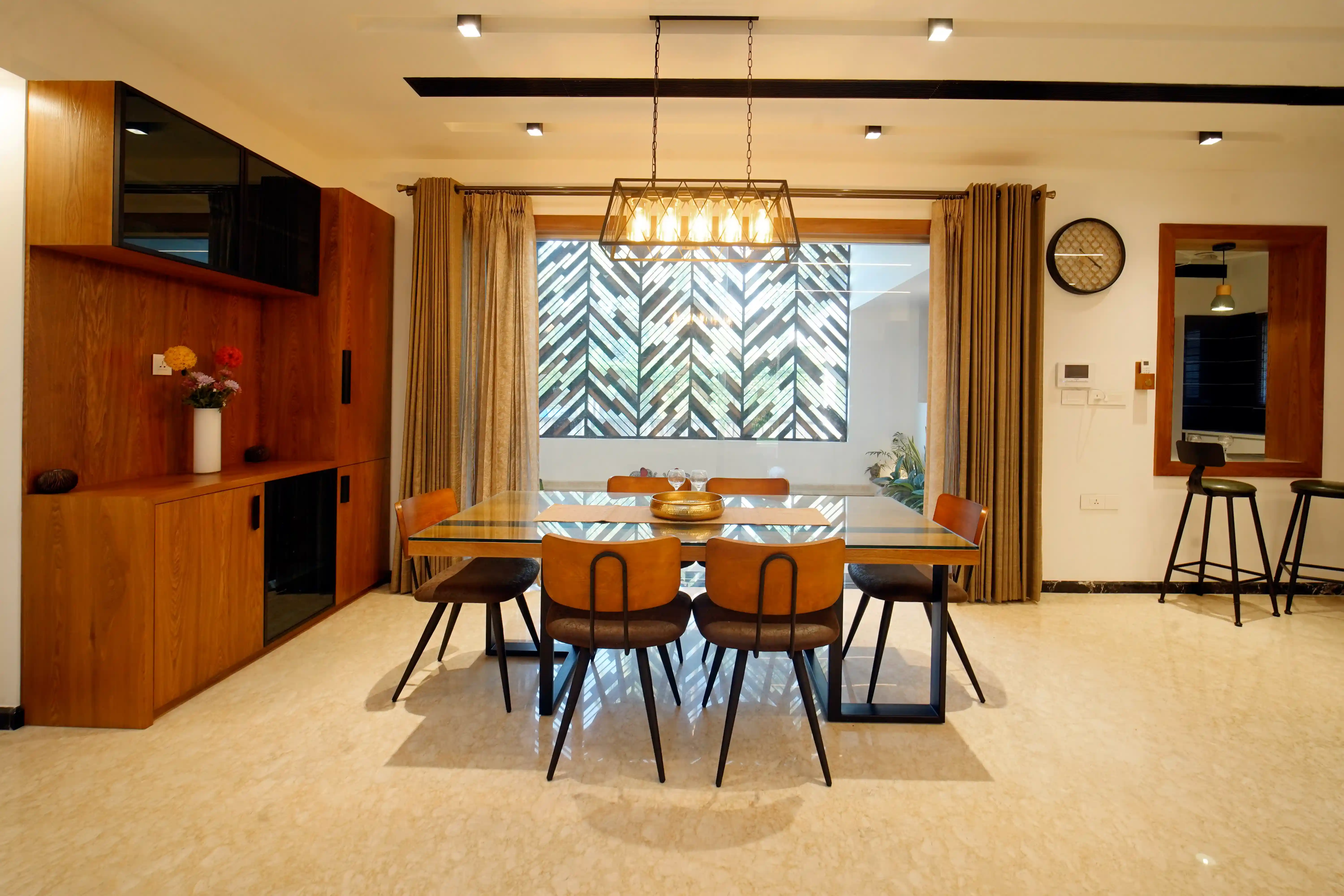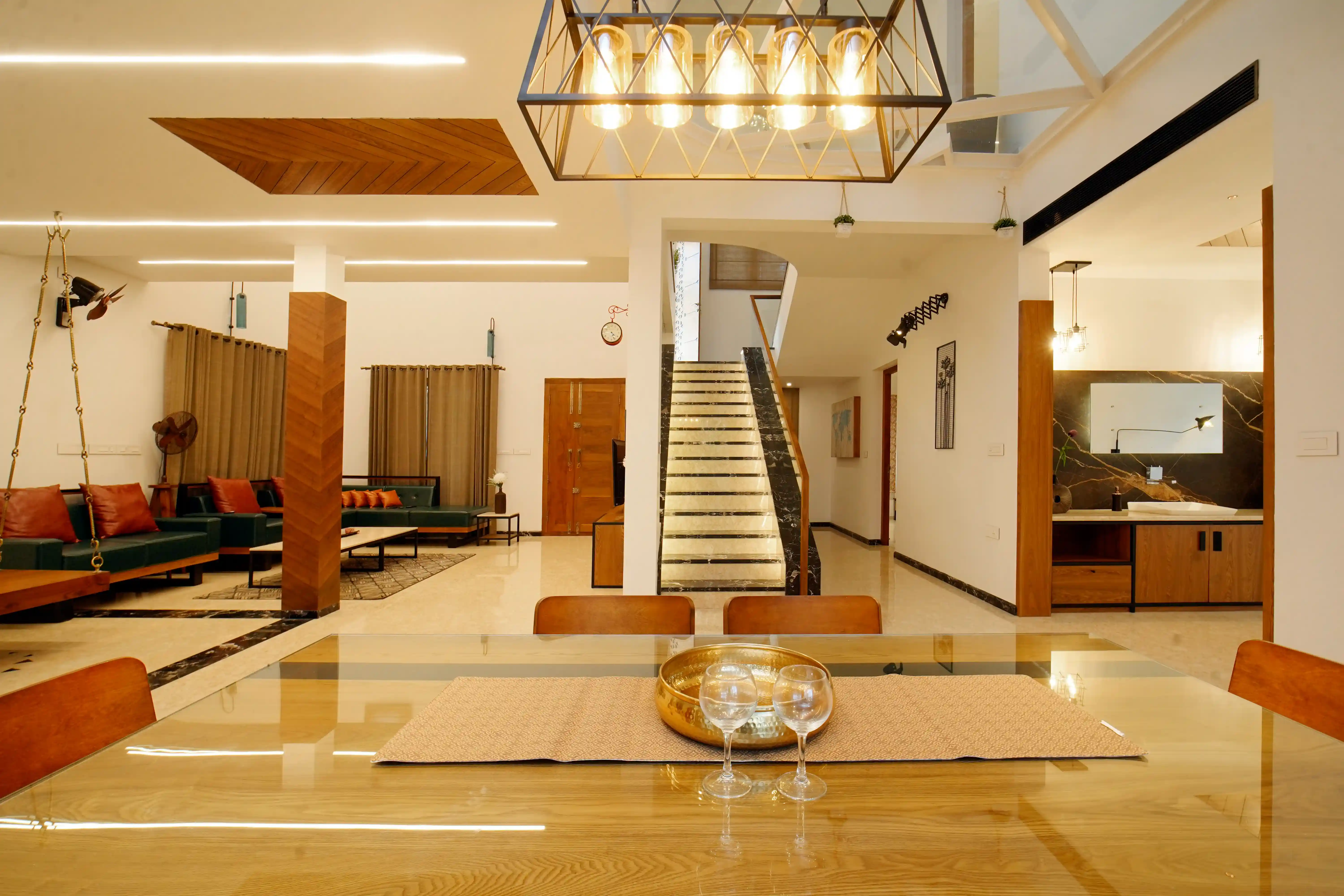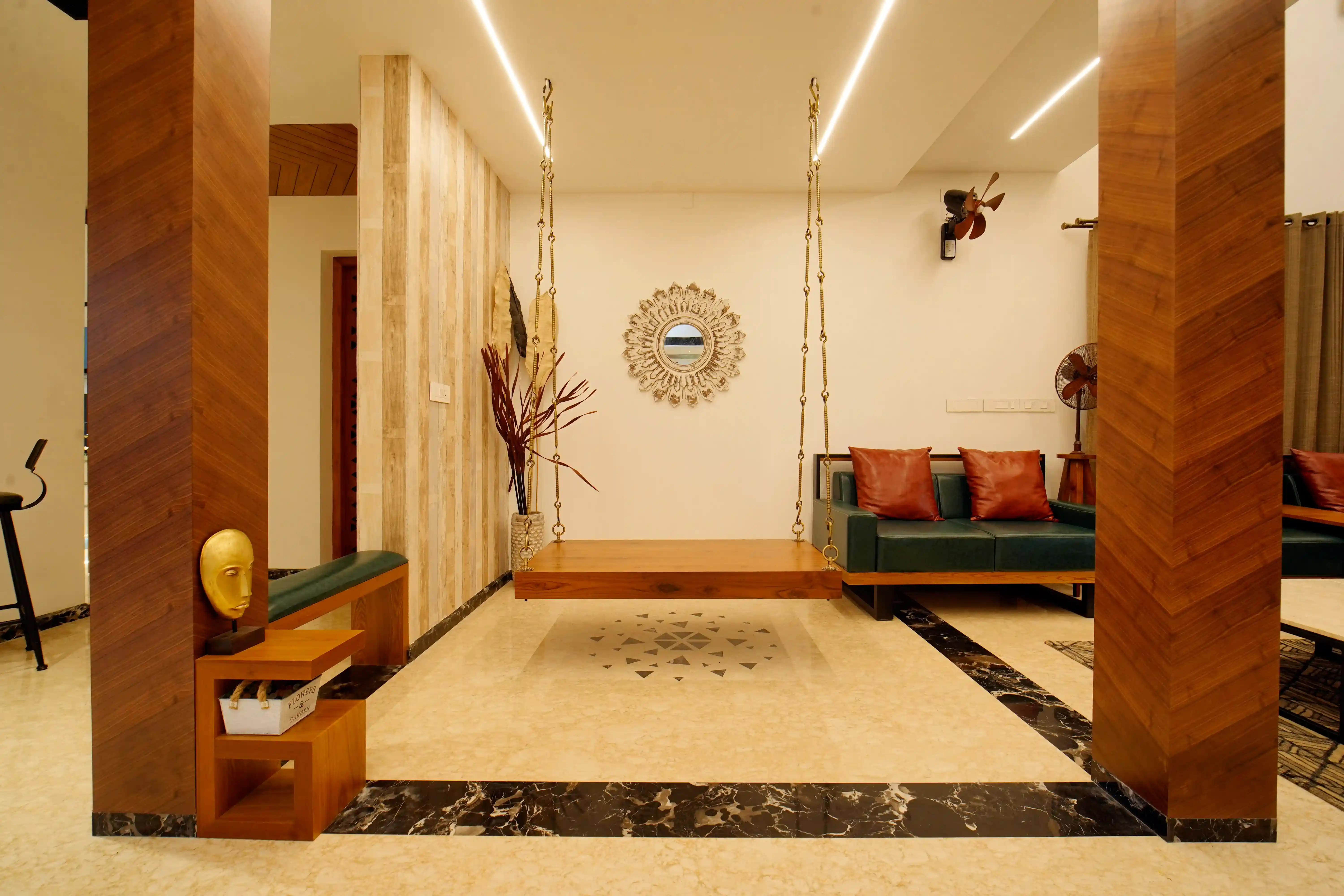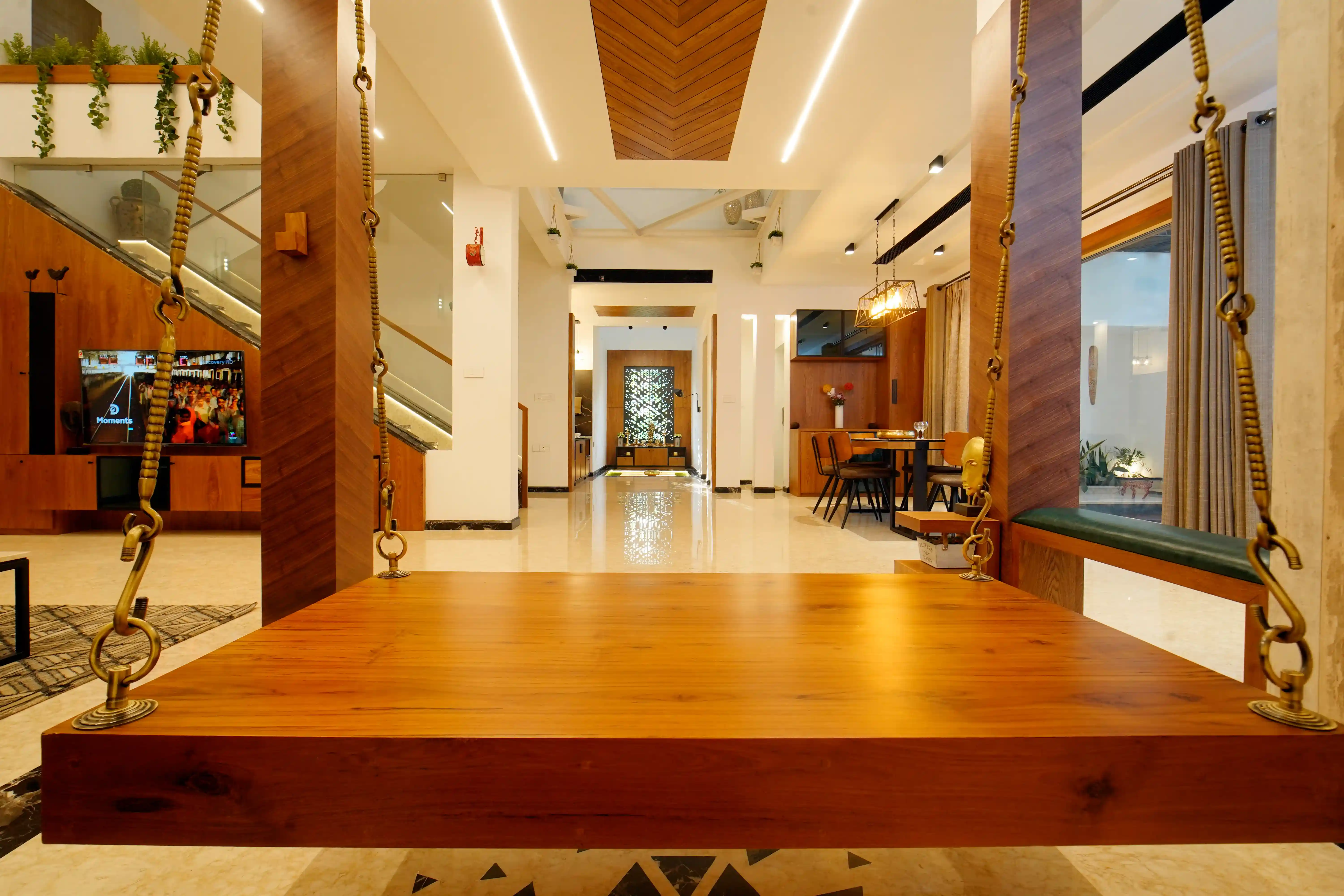 A striking feature is the indoor wooden swing (oonjal) placed at the heart of the living space. Suspended with metal chains, it acts as both a cultural element and a visual centerpiece—bringing movement, nostalgia, and character into a modern setting.