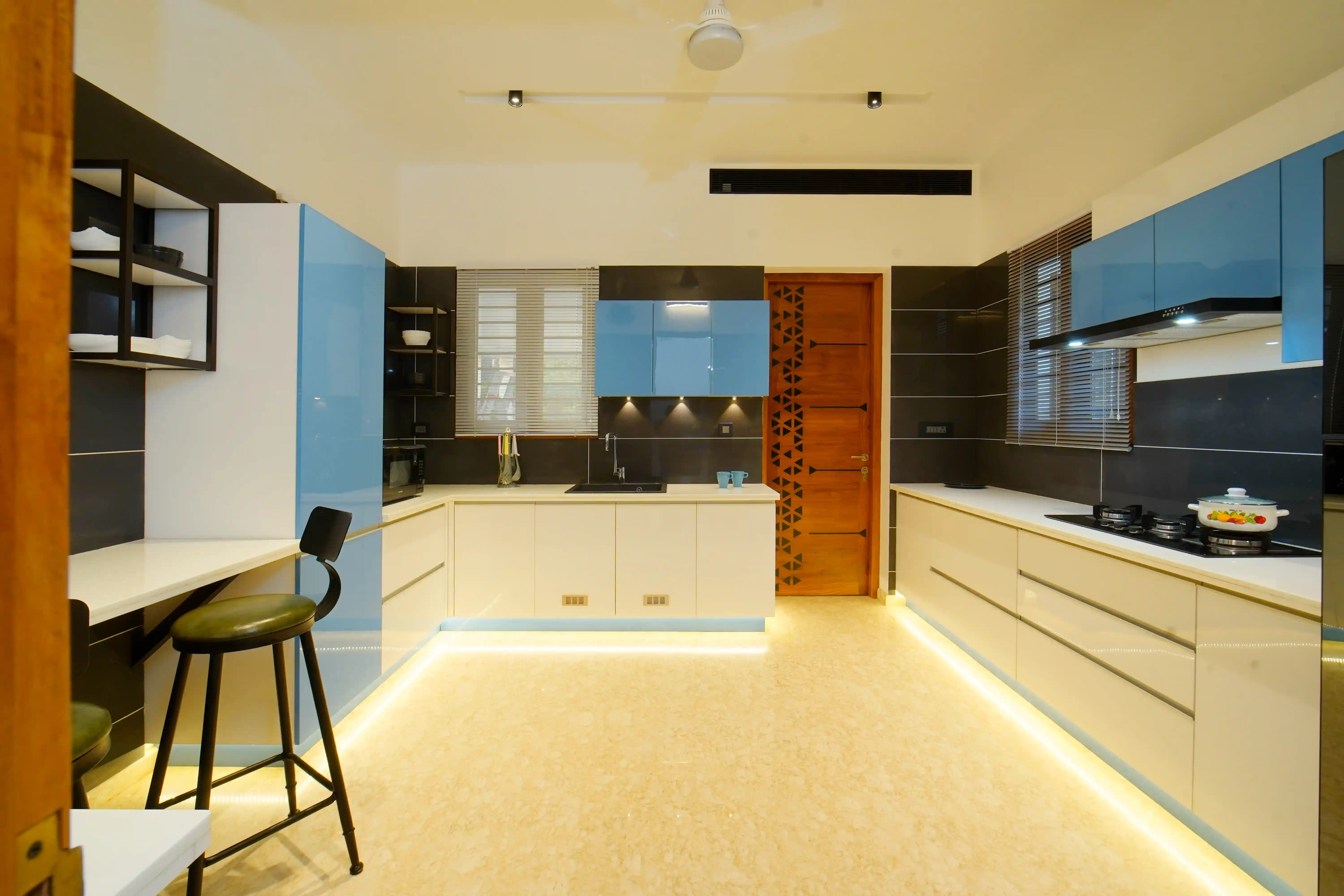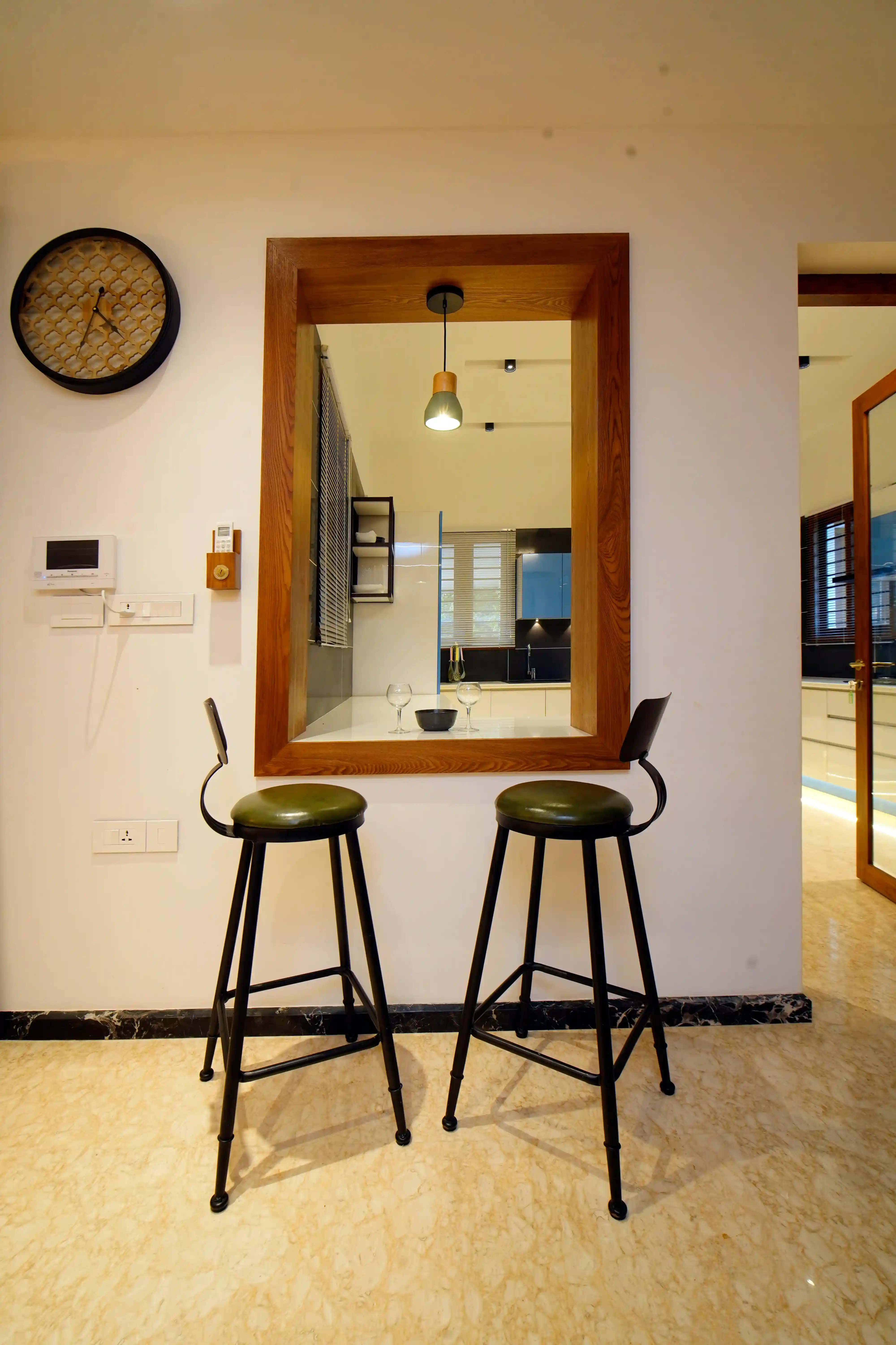 The framed pass-through counter connecting the kitchen adds a smart, social dimension to the design. It functions as a casual dining or serving space while visually linking two zones, making the layout more interactive and efficient.