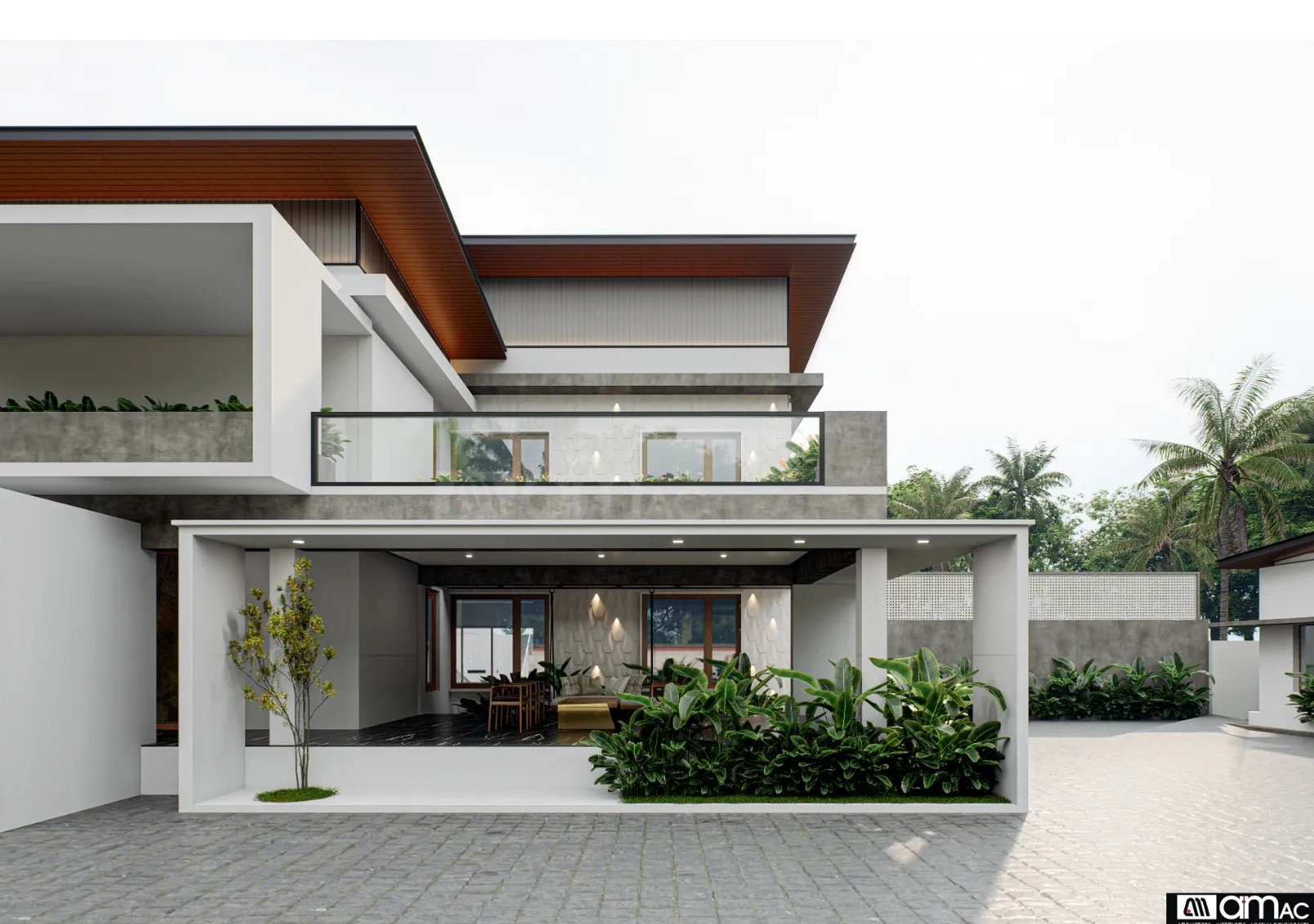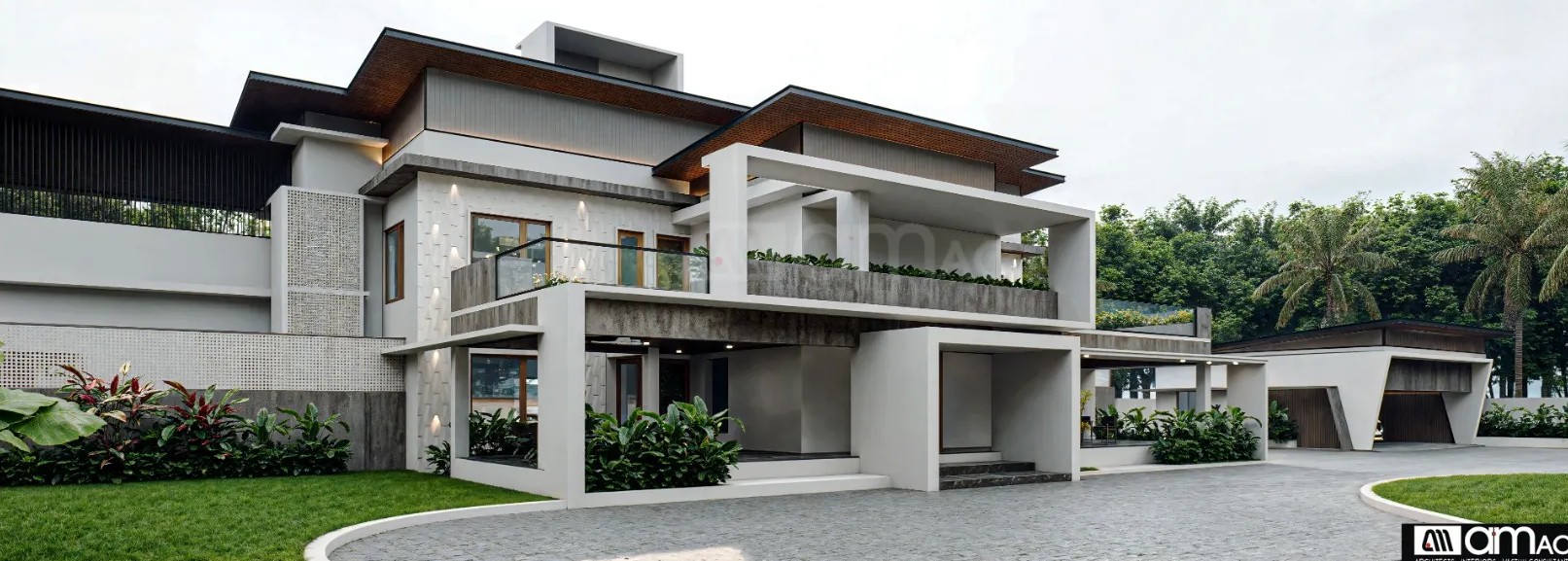 • Combination of textured concrete, plaster finishes, and wood elements