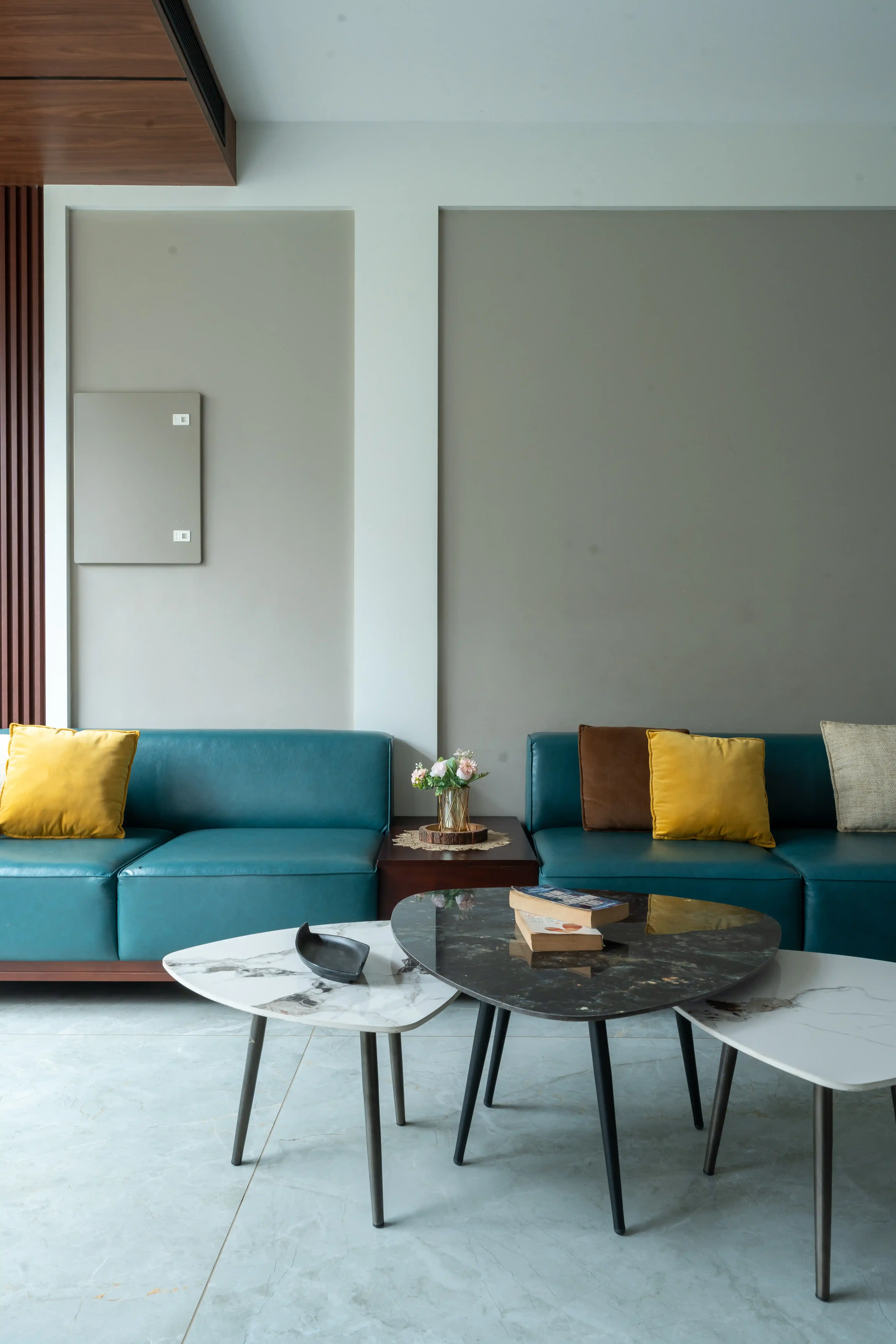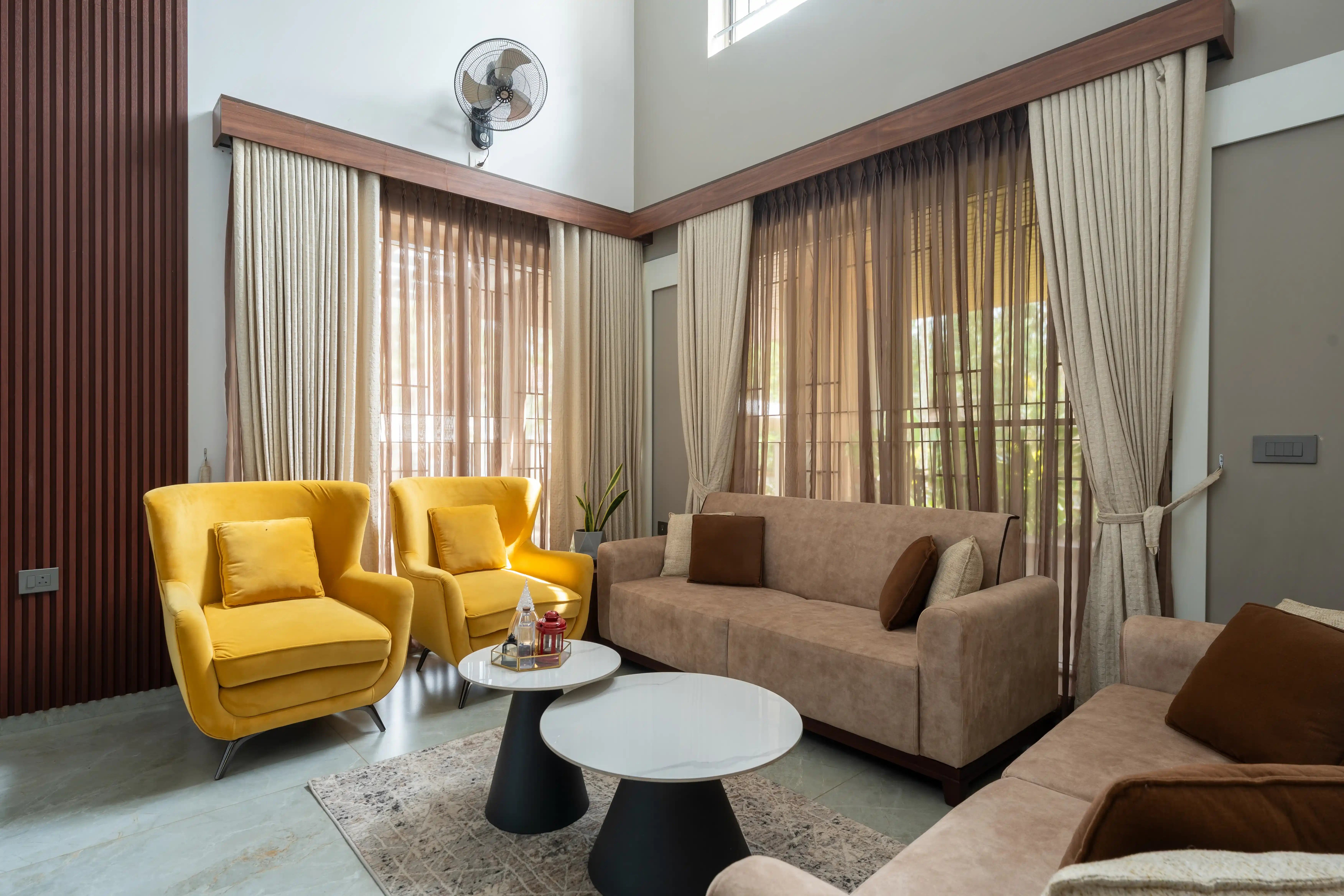 Inside, the spaces are bright and uncluttered, defined by clean lines, neutral palettes, and subtle contrasts. The dining area seamlessly integrates with a sleek staircase, while the living spaces feel soft and inviting with layered textures, warm lighting, and carefully chosen furniture. Large openings and curtains filter natural light, enhancing comfort and spatial calm.